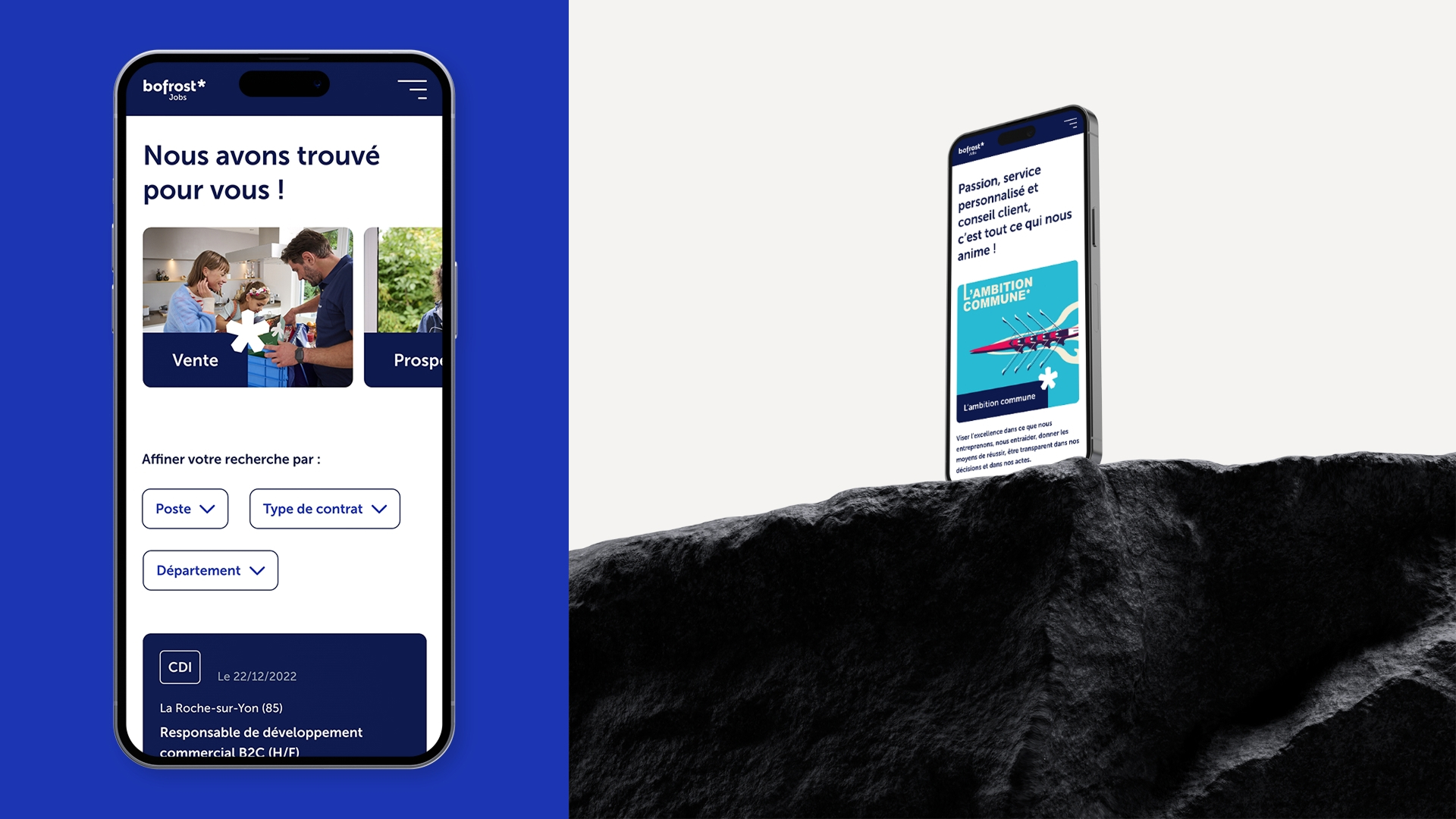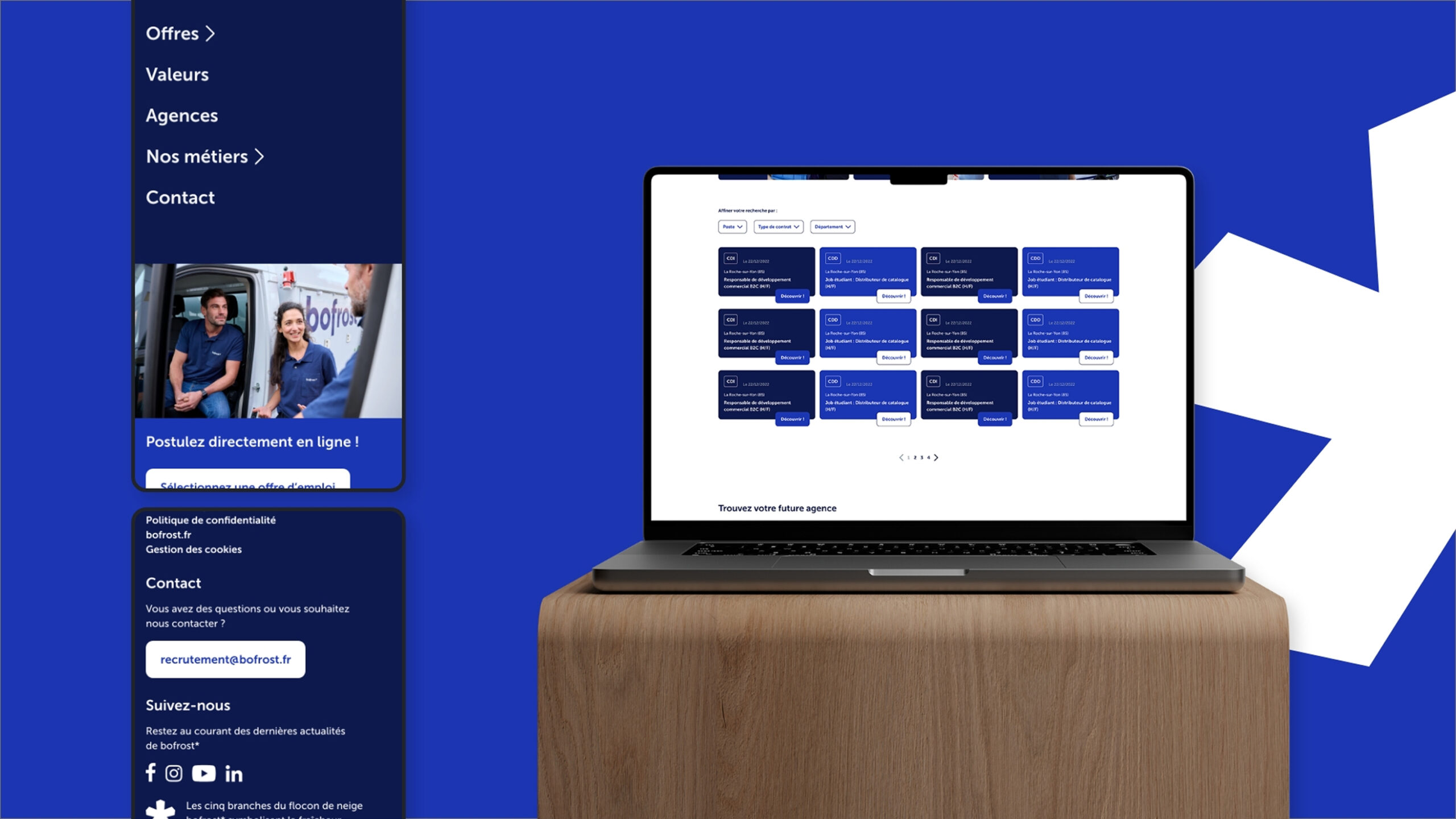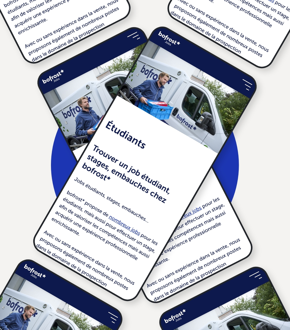 Nous avons accompagné bofrost* dans la création d’un site clarifiant l’accès aux offres d’emploi, présentant les valeurs et les profils recherchés, tout en proposant une interface fluide pour les candidats et une gestion de contenu entièrement autonome pour les équipes RH.