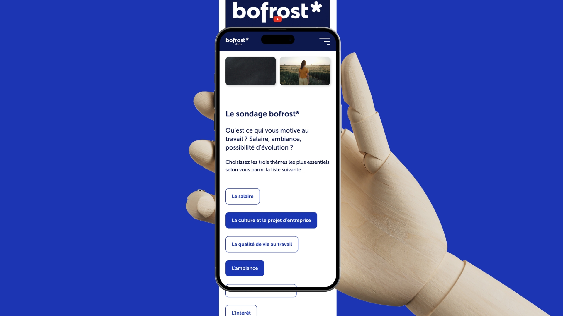 L’objectif principal était de concevoir un espace dédié au recrutement cohérent avec l’identité visuelle déjà établie de bofrost* France, tout en mettant l’utilisateur au centre de la navigation. Le site devait permettre aux candidats de trouver rapidement des offres pertinentes et de s’informer efficacement sur les métiers proposés.