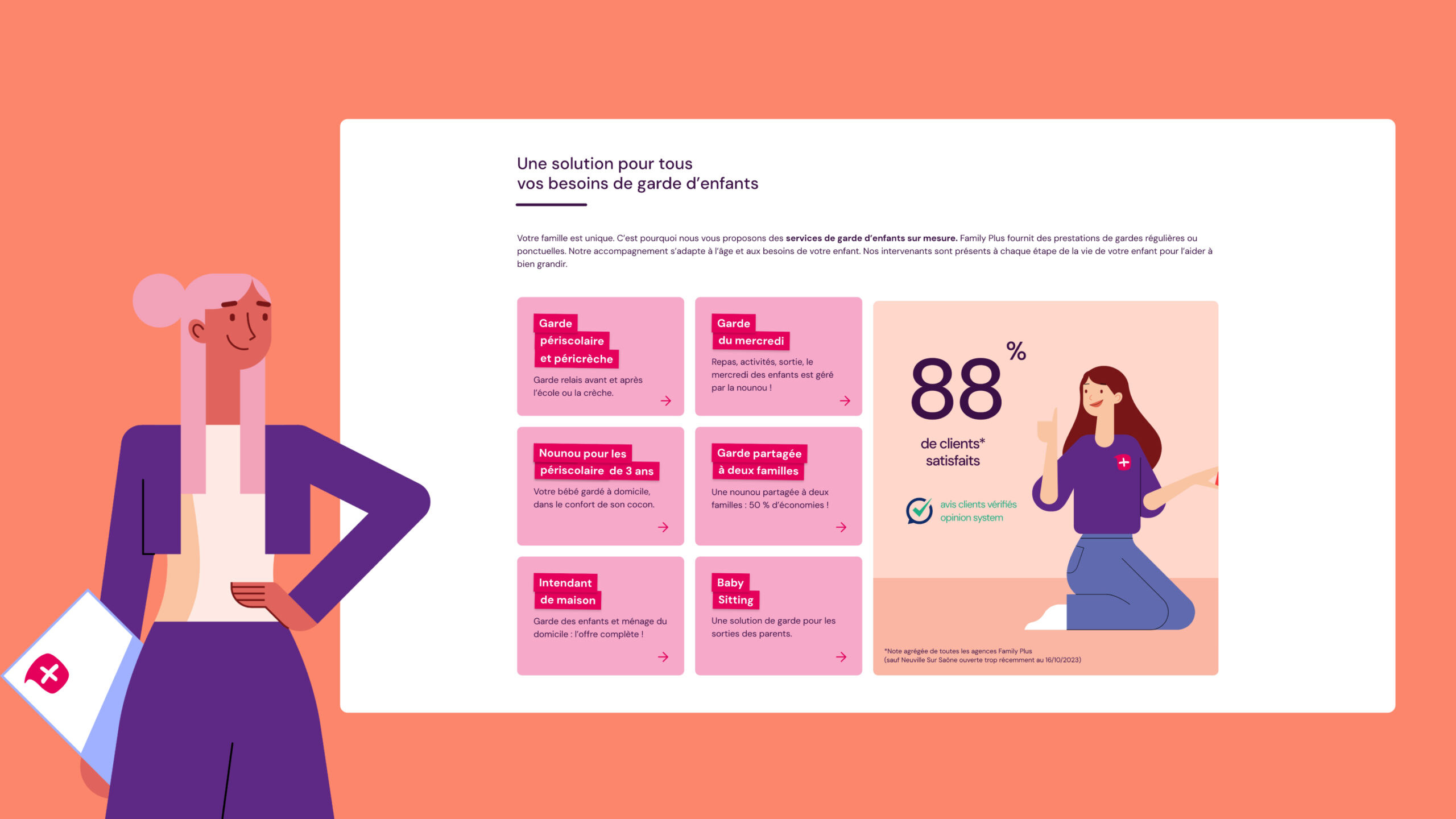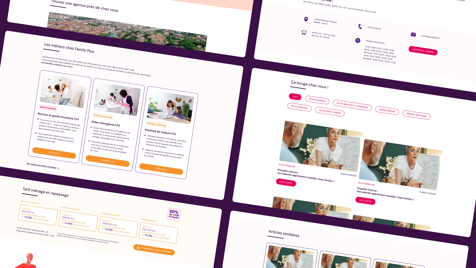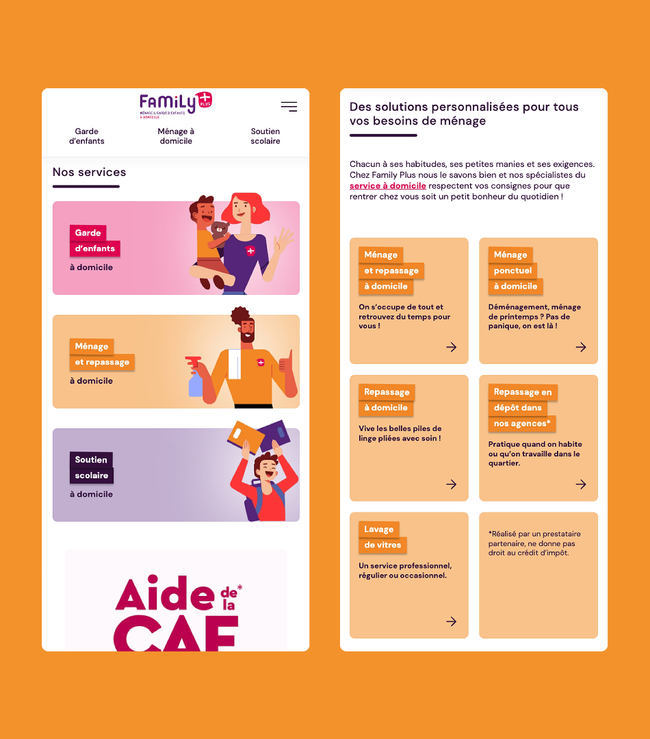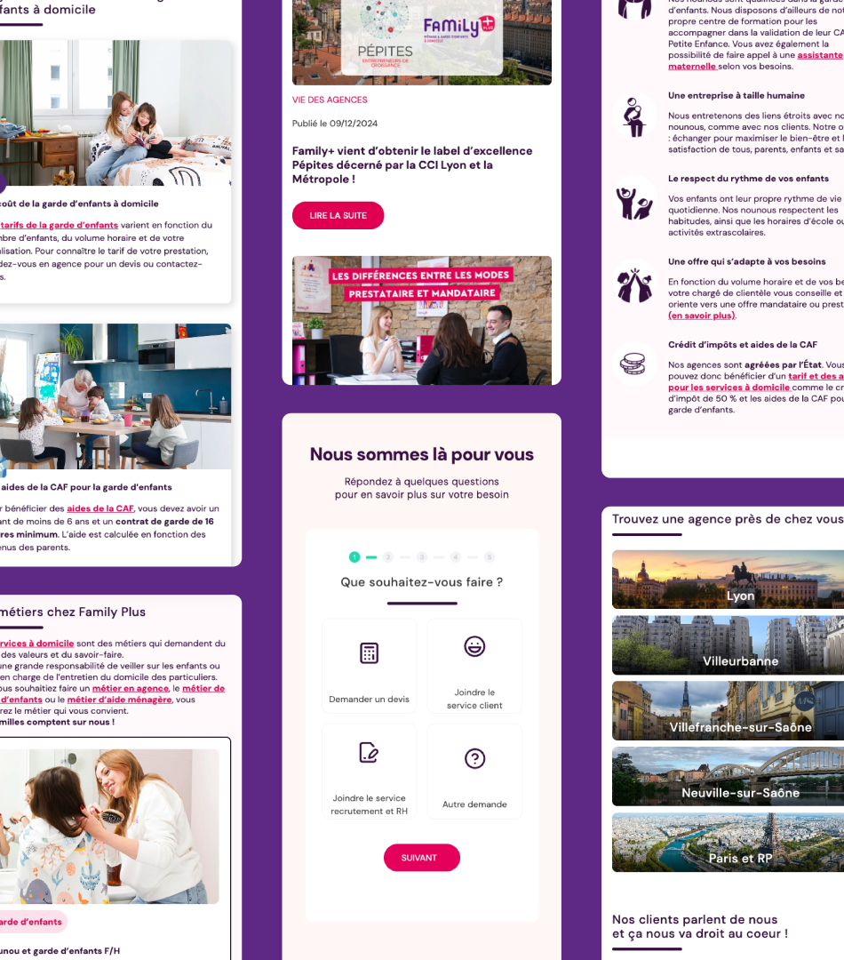 Nous avons conçu et développé le site sur-mesure en combinant une interface moderne et une expérience utilisateur fluide. Les maquettes UI & UX ont été créées pour refléter l’identité de Family Plus et guider l’utilisateur vers les contenus et services clés.