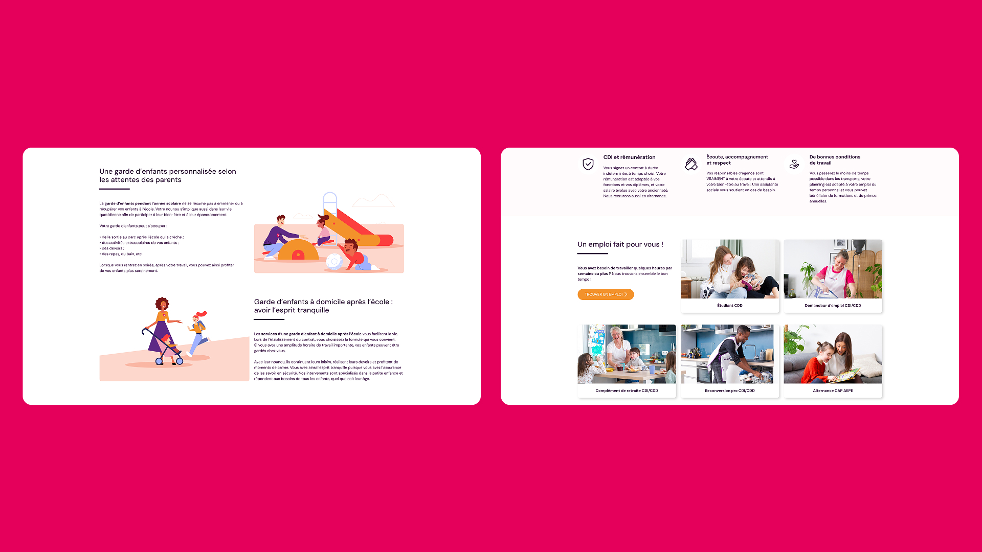 Le projet a été centré sur la refonte intégrale du site, afin de rendre l’expérience plus fluide, moderne et adaptée aux familles. Cela a inclus la conception de maquettes UI & UX, le développement sur‑mesure de l’ensemble des fonctionnalités, et l’optimisation de tous les parcours utilisateurs pour faciliter l’accès aux services.